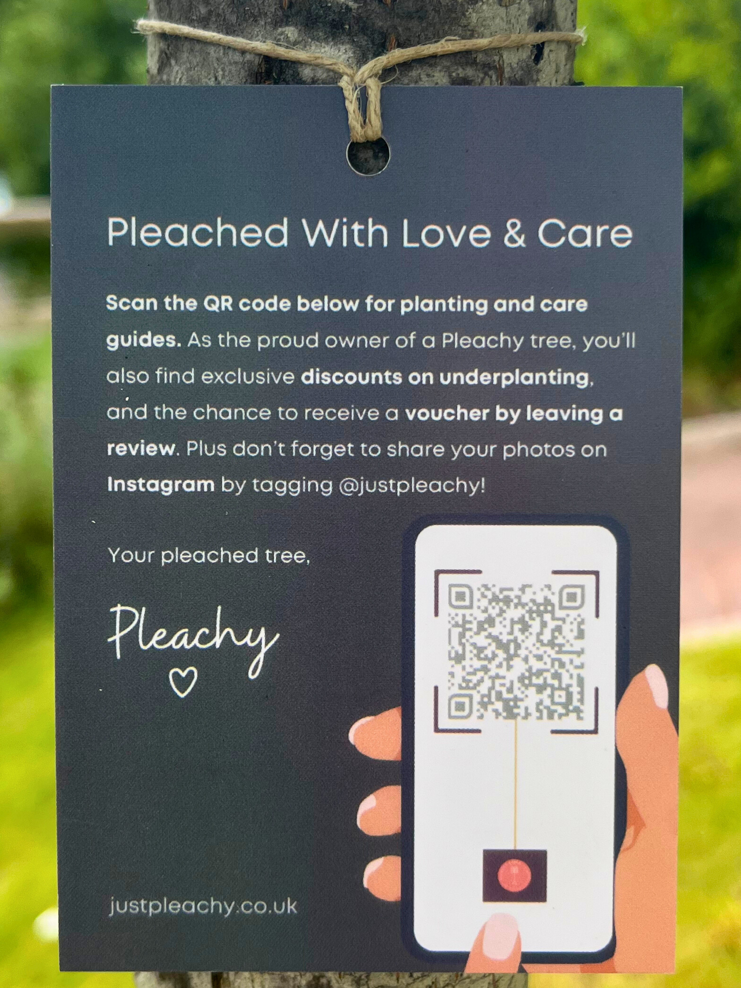 I’m Pleachy, your new pleached tree. It's a pleasure to be in your garden, and I hope you're enjoying my company. Read on for useful guides and exclusive offers, and don't forget to leave a review for a £100 Just Pleachy gift card or tag your photos on Insta!